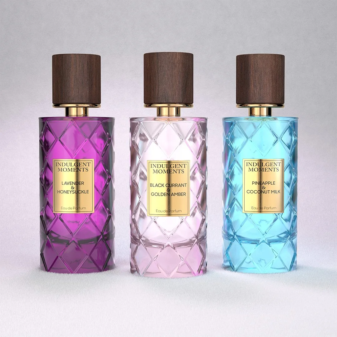 Indulgent Moments is a mature, classy women’s brand, with an extensive library of fragrances. These bottle designs reflect the refined elegance of the brand with gold elements and quilted patterns. The wooden caps add a natural, familiar touch. Rendered with soft velvet and dramatic lighting, adding striking visualization with a luxurious finish.